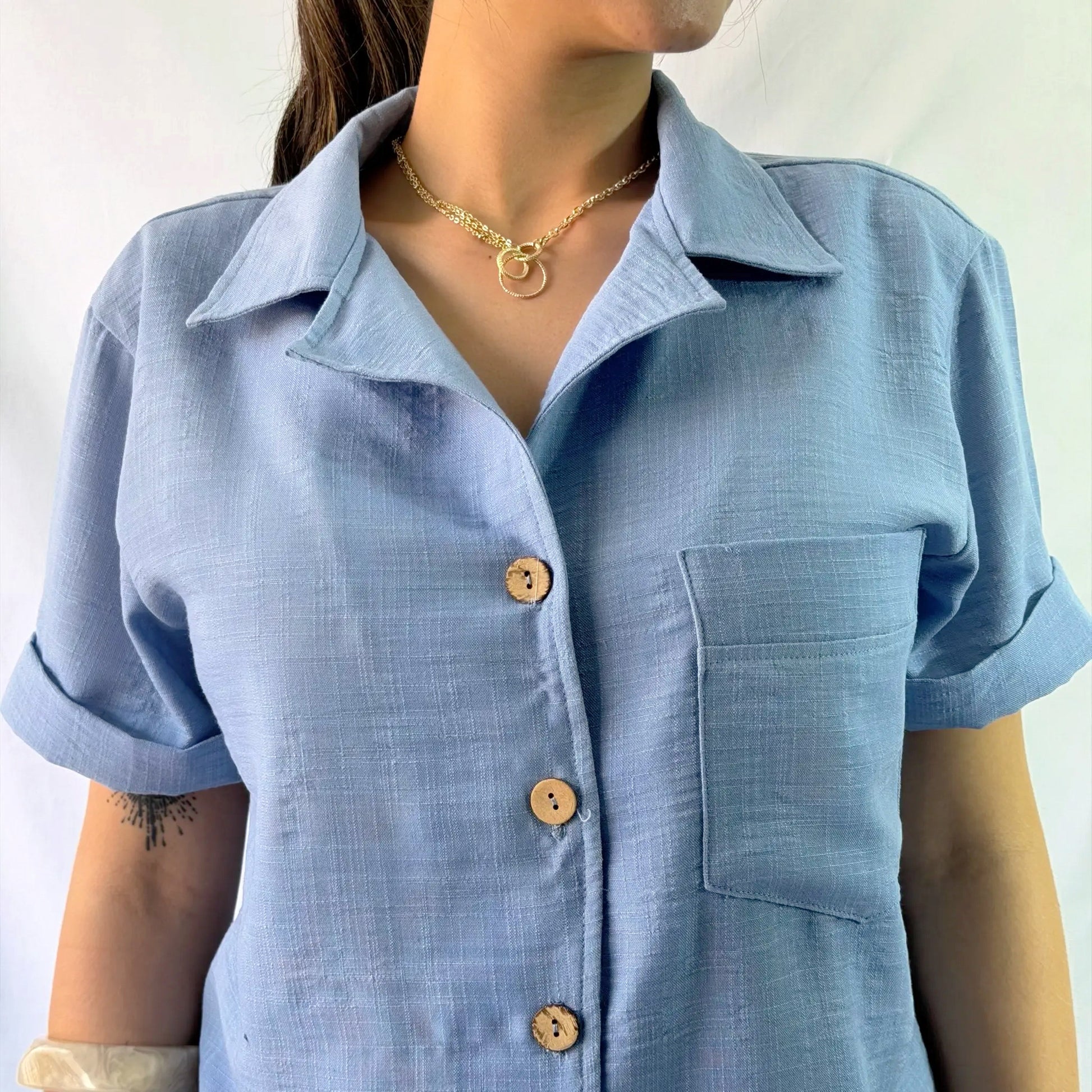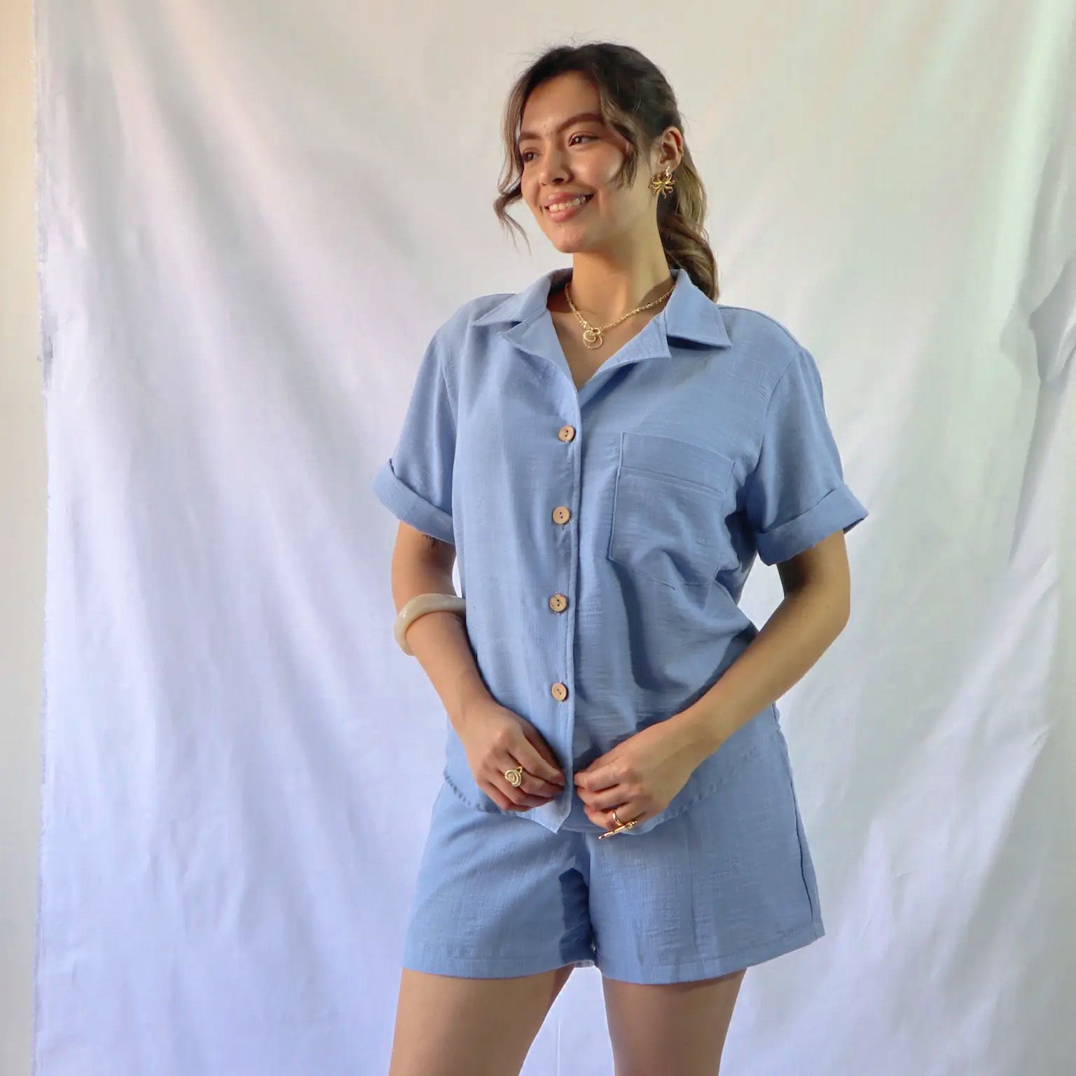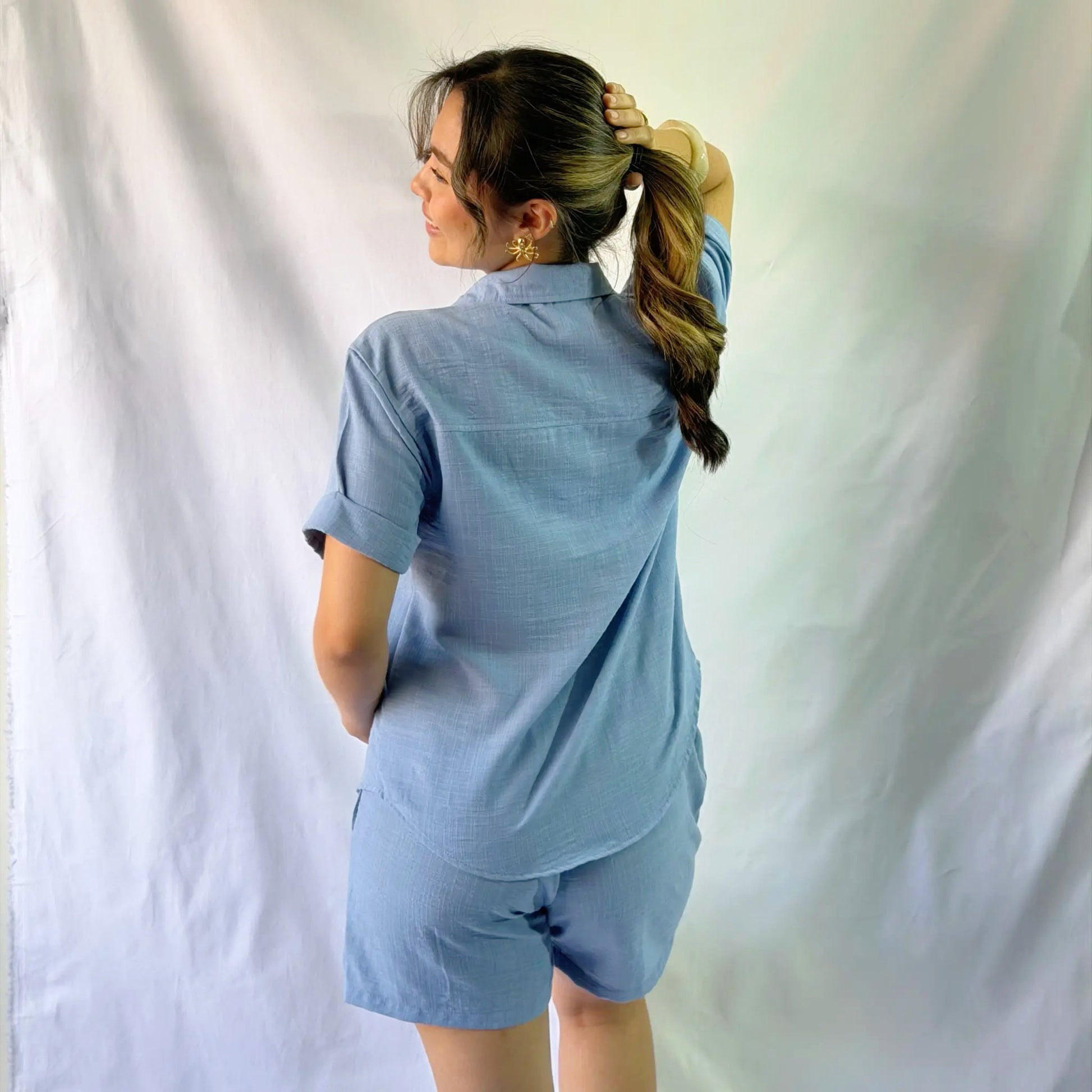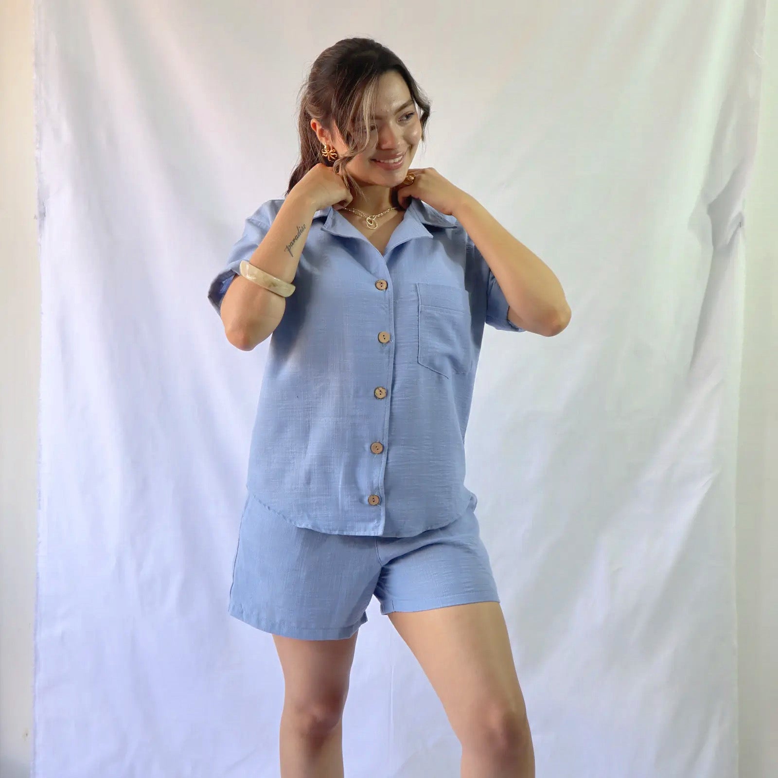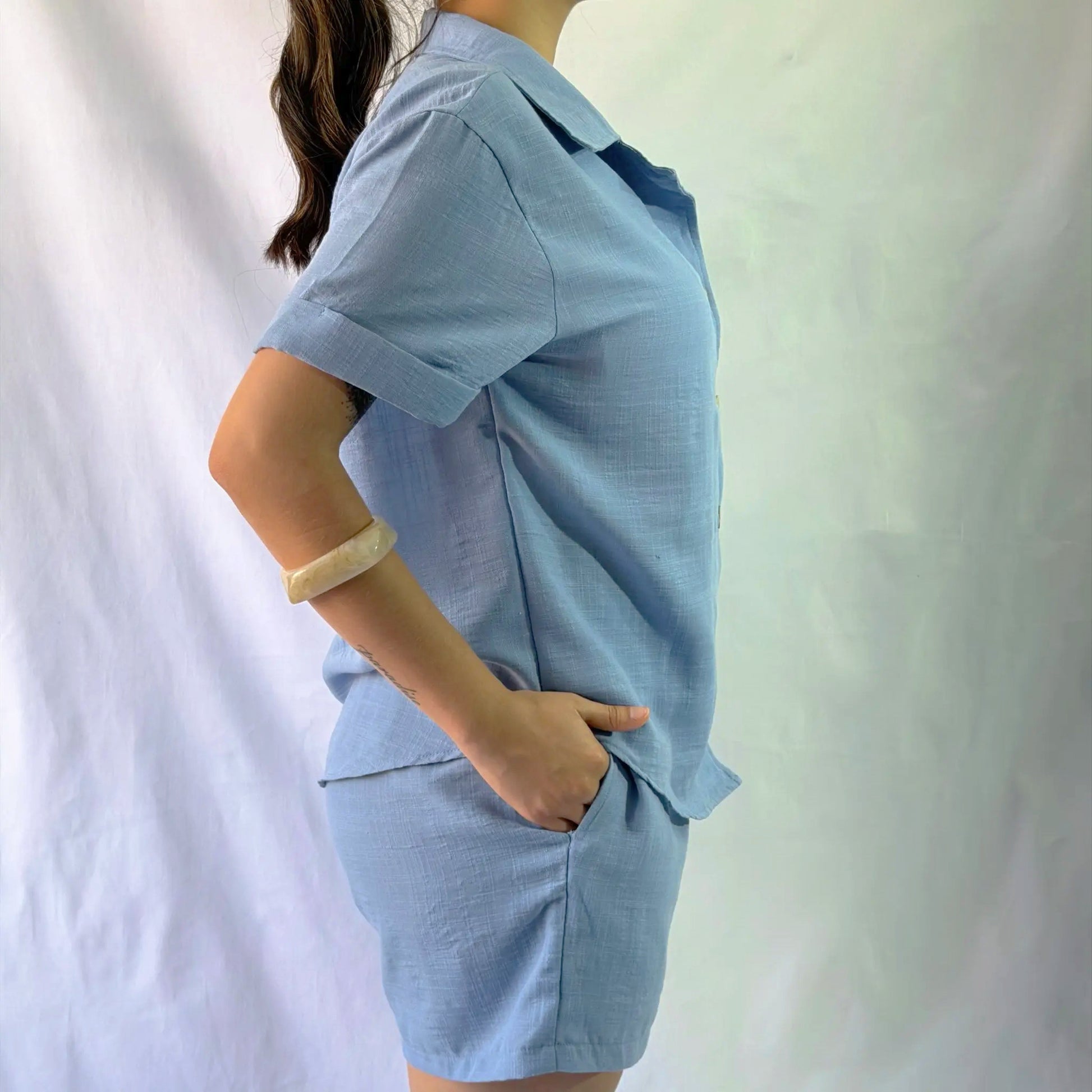 Está confeccionado en lino. Su diseño incluye botones delicados de coco, bolsillos en los laterales y resorte desde los costados hasta la parte posterior del short.